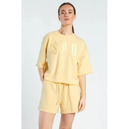 Ga voor ontspannen zomerse dagen met deze gele dames sweatshort van Spooq the label. De Jott short heeft een losse pasvorm en een regular waist, waardoor je vrij kunt bewegen en toch een mooie, casual look houdt. De effen gele kleur geeft je outfit direct een frisse, zonnige uitstraling, ideaal voor warme dagen.Comfortabele short voor elke zomerdag Gemaakt van 100% katoen, voelt zacht en luchtig aan op de huid Loose fit voor een ontspannen en comfortabel gevoel Elastische tailleband met koord voor een persoonlijke pasvorm Praktische zijzakken voor kleine essentials zoals sleutels of telefoon Effen gele kleur, makkelijk te combineren met T-shirts en tops Geschikt voor de zomer, van stranddag tot ontspannen weekend Wasbaar op 30 graden, lauw strijkbaar en niet in de droogtrommelCasual combineren in het dagelijks levenDraag de Jott short met een eenvoudige witte top en sneakers voor een rustige, alledaagse look. Voor een dagje strand is een luchtige linnen blouse eroverheen een fijne combinatie. De elastische tailleband maakt het aan- en uittrekken makkelijk, ook als je veel onderweg bent.Spooq the label als speelse basis in je kastSpooq the label staat voor toegankelijke en modieuze items die je makkelijk aantrekt en combineert. De collecties sluiten aan op de trends van nu, met aandacht voor draagbaarheid in het dagelijks leven. Zo vul je je kledingkast met stukken die je vaak en graag pakt.Een zonnige basic short waar je de hele zomer plezier van hebt.