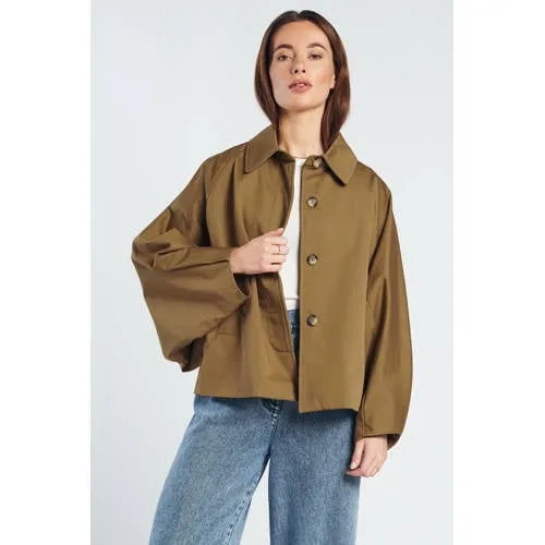 Geef je voorjaarsoutfit een frisse update met deze olijfgroene jas van Spooq the label. Het korte, rechte model met vleermuismouwen en een brede kraag valt soepel om je heen en creëert een moderne, ontspannen look. De effen olijfgroene kleur combineert makkelijk met je garderobe en voelt direct passend voor het lente seizoen.Details die het verschil maken Kort model dat mooi valt op een hoge taille broek of jurk Vleermuismouwen zorgen voor een losse pasvorm bij de schouders en veel bewegingsruimte Brede widespread kraag die open gedragen kan worden voor een nonchalante look Blinde knoopsluiting voor een rustige en strakke voorkant Effen olijfgroene kleur die gemakkelijk combineert met neutrale en donkere tinten Gemaakt van 100 procent katoen, een stevige stof met een natuurlijke touch Zijzakken om je handen in weg te stoppen of kleine essentials op te bergen Geschikt als tussenjas voor het lente seizoenVoor dagelijkse looks in het voorjaarDeze jas draag je net zo makkelijk over een jeans met T-shirt als over een jurk of rok. Het korte silhouet houdt je outfit luchtig, terwijl de lange mouwen je toch genoeg warmte geven op frisse dagen. Ideaal voor onderweg naar werk, een koffiedate of een wandeling door de stad.Spooq the label: eigentijdse stijlSpooq the label richt zich op moderne items met een duidelijke signatuur. De collectie bestaat uit doordachte stijlen die goed aanvoelen in het dagelijks leven en eenvoudig te combineren zijn. Met deze jas haal je een betrouwbaar basisstuk in huis dat meerdere seizoenen mee kan in je garderobe.Een stijlvolle tussenjas die je lente outfits net dat beetje extra geeft.