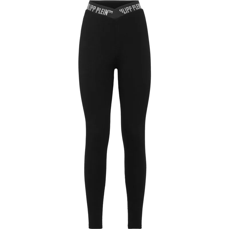 Verfraaid Stretch katoenen legging met hoge taille. Asymmetrische elastische tailleband met strassteentjes en letters van het merk. Zomen gestikt met twee naalden.