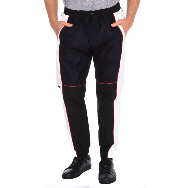 Sportbroek Dsquared2. Elastische tailleband met verstelbaar trekkoord. Twee zakken met rits aan de zijkanten. Twee open zakken op de achterkant. Strepen aan de zijkanten. Mesh paneel op de voorkant. Merkdetail aan de onderkant van één been. Hems met elastische afwerking. Naden in toon zichtbaar. Samenstelling: 100% polyester Onderhoud: Wassen op maximale temperatuur 30º. Strijken op lage temperatuur. Geen bleekmiddel gebruiken. Geen droger gebruiken. Niet chemisch reinigen.