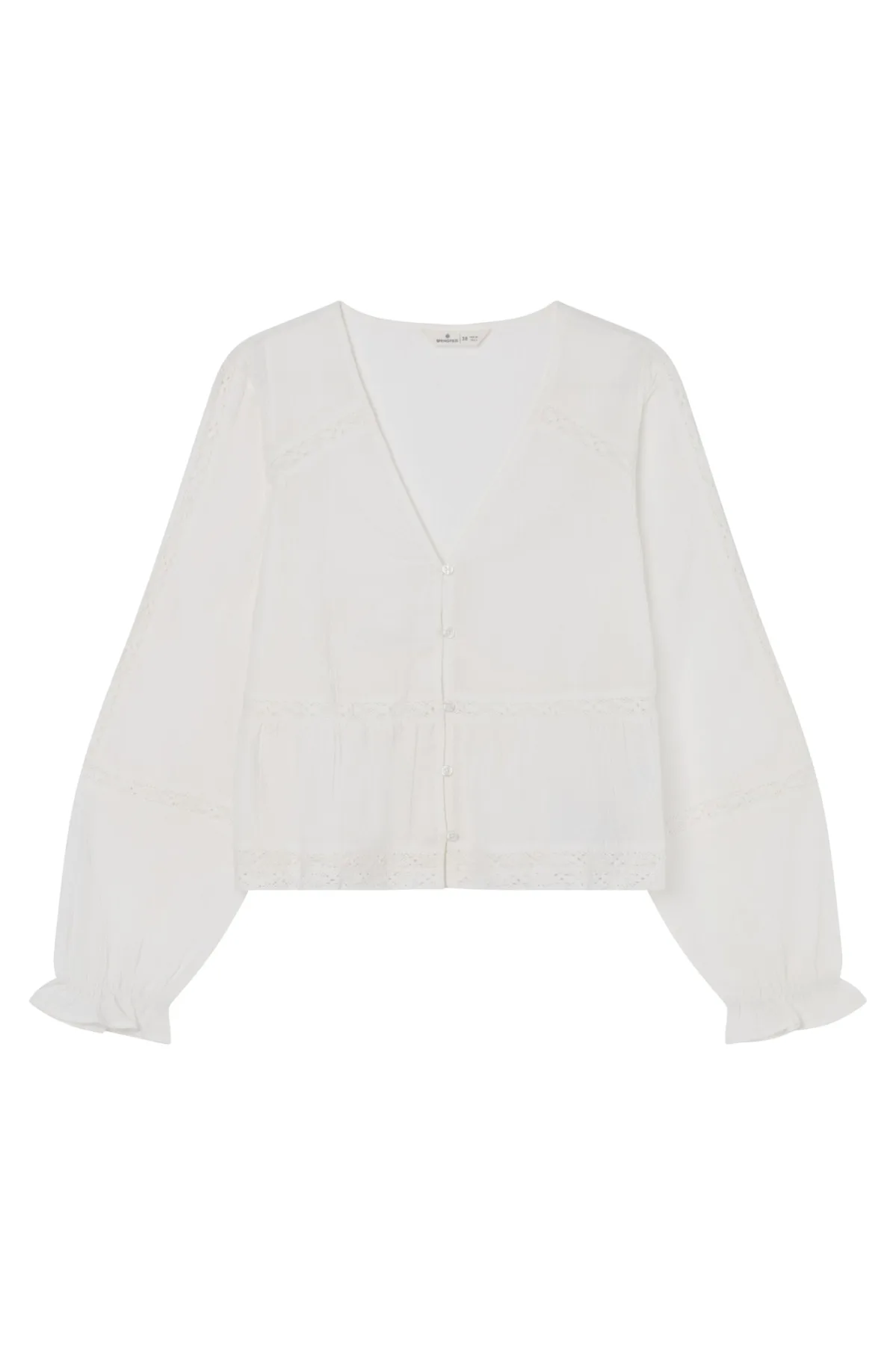 Blouse type: Klassieke blouse; Design: Gevoerde zoom/rand; Type sluiting: Knoopsluiting; Materiaal: Katoen; Motief: Effen; Kraag: Zonder kraag; Details: Kant; Extra's: Op staal naden; Pasvorm: Normale pasvorm; Armlengte: Lange mouw; Lengte: Normale lengte