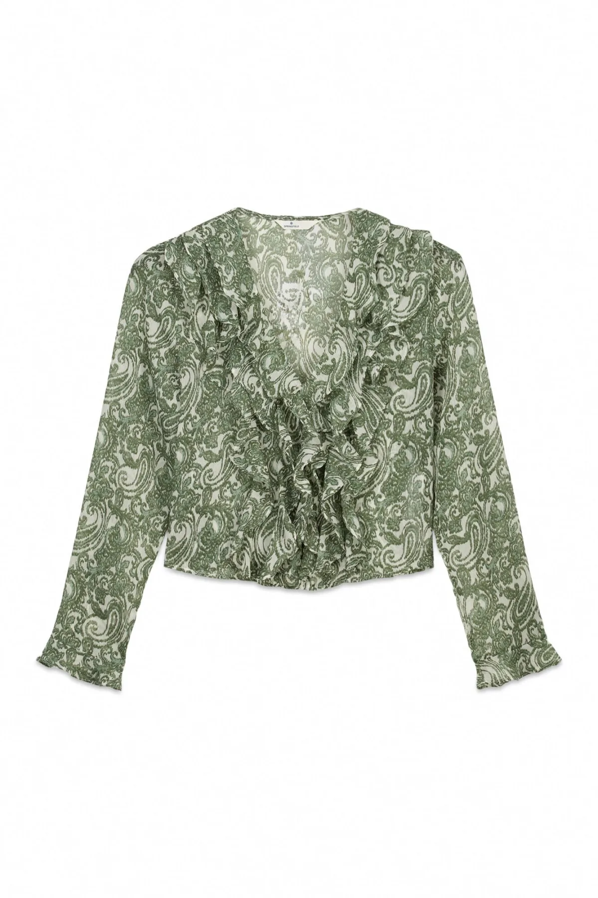 Blouse type: Blouseshirt; Design: Gevoerde zoom/rand; Details: Volant; Extra's: All-over patroon; Pasvorm: Normale pasvorm; Armlengte: Lange mouw; Lengte: Normale lengte