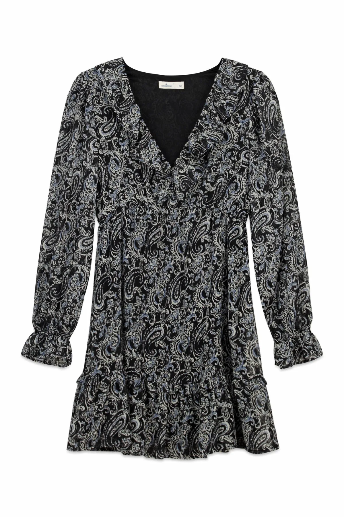 Design: Gevoerde zoom/rand; Halstype: V-hals; Motief: Paisley; Details: Volant, Gedrapeerd; Extra's: All-over patroon; Lengte: Kort/mini; Pasvorm: Normale pasvorm; Armlengte: Lange mouw