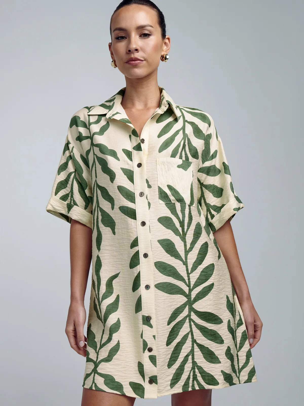 Design: Borstzak; Type sluiting: Knoopsluiting; Materiaal: Viscose; Motief: Bloemenprint; Kraag: Kentkraag; Extra's: All-over patroon; Lengte: Kort/mini; Snit: Recht; Pasvorm: Losse pasvorm; Armlengte: Halve mouw