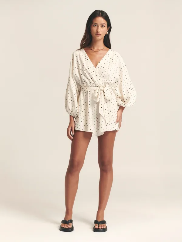 Design: Diepe snit/decolleté; Type sluiting: Knoopsluiting; Halstype: Wikkeltop; Motief: Gestippeld; Details: Gedrapeerd, Wikkel design; Extra's: Lichte stof; Lengte: Kort/mini; Pasvorm: Losse pasvorm; Armlengte: Driekwart mouw