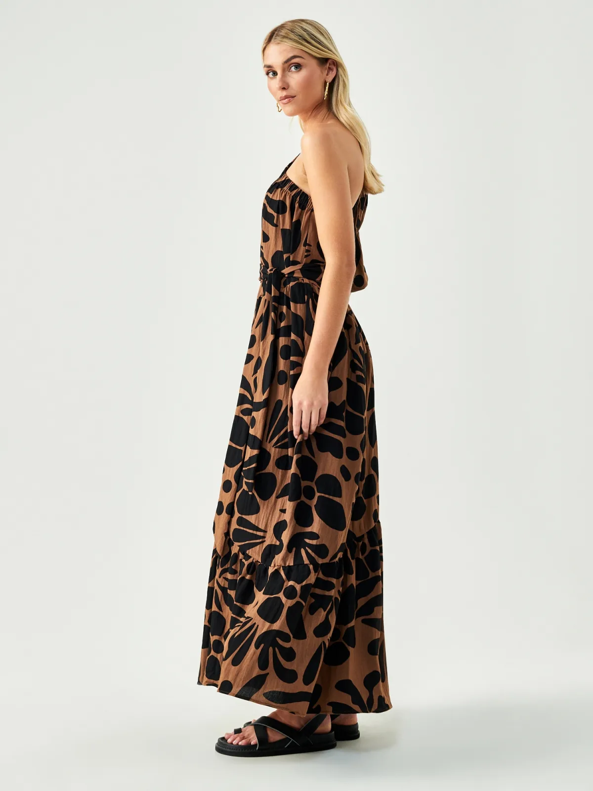 Design: Pofmouwen, Tailleriem; Materiaal: Viscose; Soort bandjes: One-shoulder; Details: Gedrapeerd; Extra's: All-over patroon; Lengte: Lang/maxi; Pasvorm: Normale pasvorm; Armlengte: Halve mouw