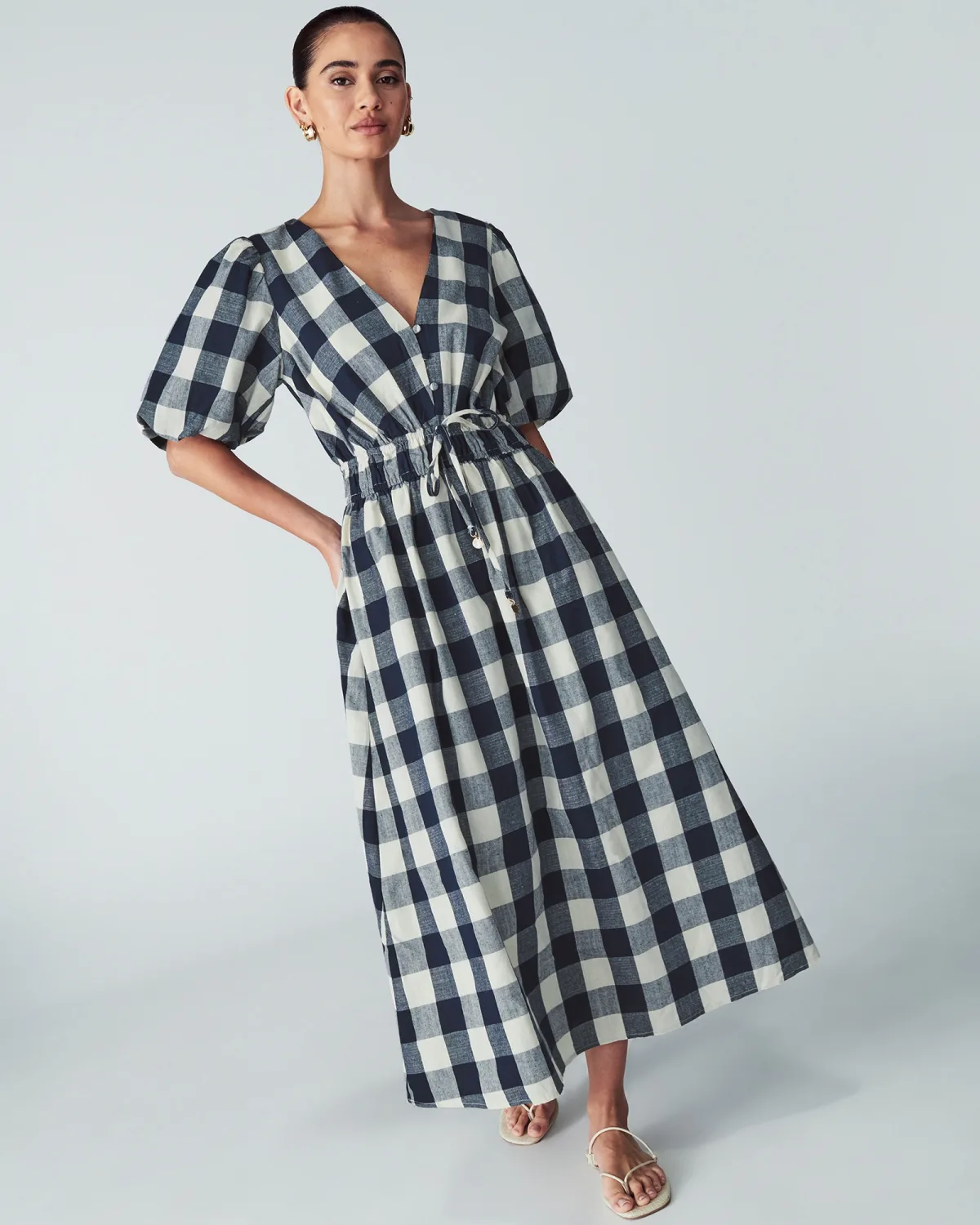 Design: Gevoerde zoom/rand; Materiaal: Katoen; Halstype: V-hals; Motief: Geruit; Details: Gedrapeerd; Extra's: All-over patroon; Lengte: 7/8 lengte; Snit: Uitlopend; Pasvorm: Normale pasvorm; Armlengte: Kwartmouw