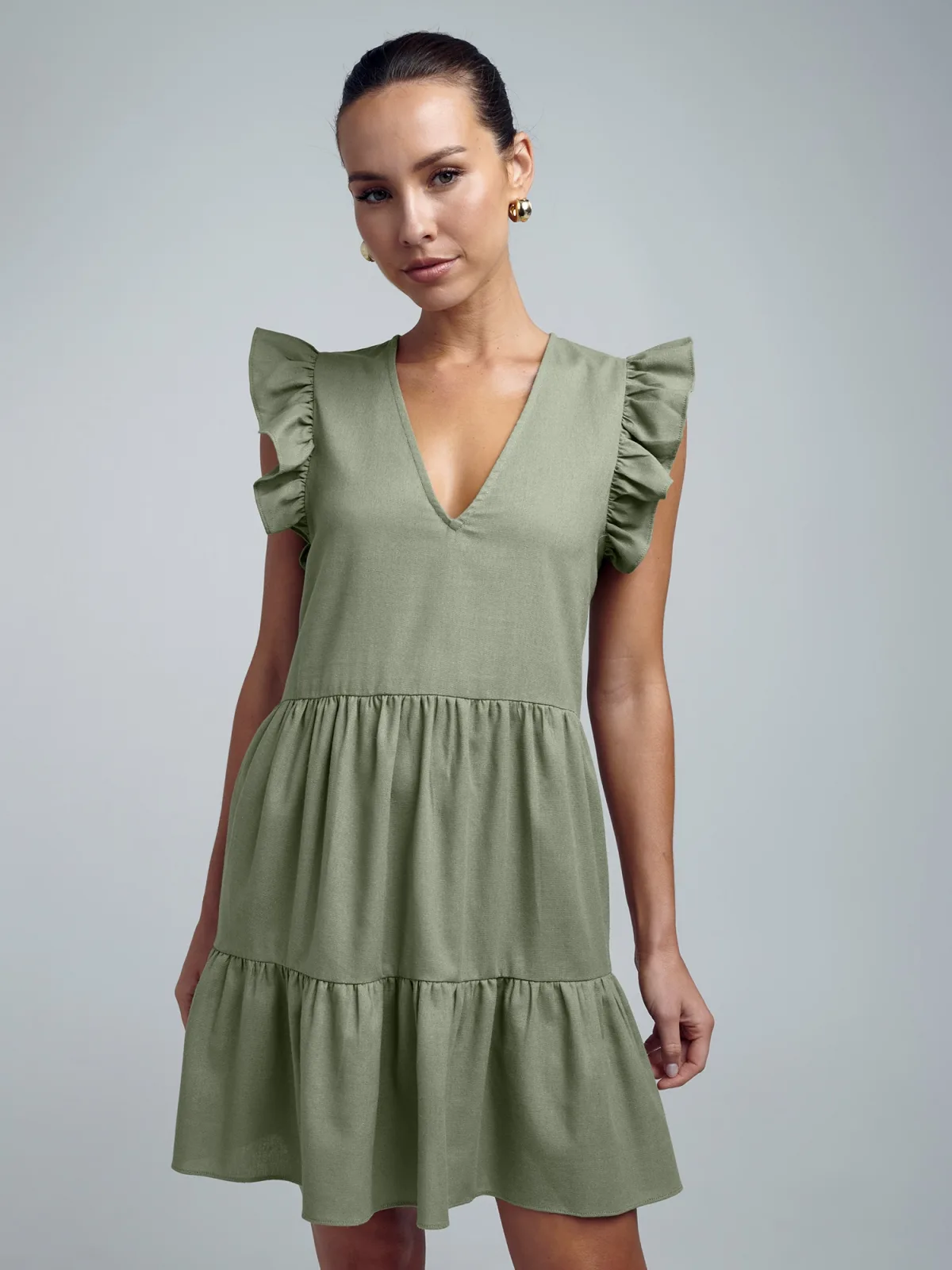 Design: Flare, Diepe snit/decolleté; Type sluiting: Knoopsluiting; Materiaal: Linnen; Halstype: V-hals; Motief: Effen; Details: Ruches, Volant, Gedrapeerd; Extra's: Op staal naden, Lichte stof; Lengte: Kort/mini; Snit: Uitlopend; Pasvorm: Losse pasvorm; Armlengte: Kwartmouw