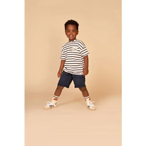 Deze donkerblauwe jongens sweatshorts van Stains&Stories zijn klaar voor elke speeldag. De korte broek heeft een sportieve uitstraling en is gemaakt van een zachte sweatstof met 98% katoen en 2% elastaan. Dat zorgt voor een soepel gevoel en genoeg bewegingsvrijheid voor peuters, kleuters en schoolkinderen.Comfortabel en klaar om in te bewegen Zachte sweatstof met 98% katoen en 2% elastaan voor een soepel draaggevoel Elastische tailleband met koord voor een comfortabele, aansluitende pasvorm Effen donkerblauwe kleur die makkelijk te combineren is met T-shirts en hoodies Met zakken voor, een zak achter en cargozakken aan de zijkant voor kleine schatten Geschikt voor peuters, kleuters en schoolkinderen binnen de maatboog Peuter en Kleuter en Schoolkind Onderdeel van de actuele collectie, geschikt voor dagelijks gebruik en vrije tijdHandige korte broek voor elke dagOf het nu gaat om een dag op school, buitenspelen of een relaxed weekend, deze sweatshort biedt veel bewegingsruimte. De elastische tailleband trek je makkelijk aan en uit, wat handig is bij zelf aankleden. De verschillende zakken geven ruimte voor essentials zoals een sleutel, zakdoek of klein speelgoed.Stains&Stories voor actieve kidsStains&Stories ontwerpt kinderkleding met oog voor comfort, speelse details en dagelijks gemak. De items sluiten aan bij een actieve leefstijl, zodat kinderen vrij kunnen bewegen en spelen. Met deze korte broek haal je een praktische basic in huis die goed past binnen een moderne kindergarderobe.Een praktische, veelzijdige sweatshort waarin kinderen vrij kunnen bewegen.