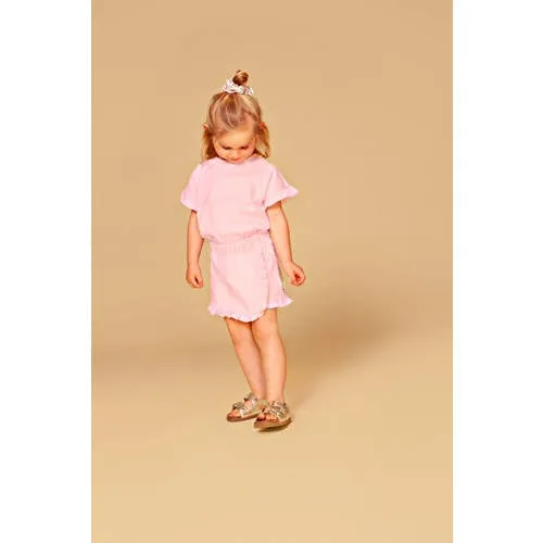 Dit roze meisjes T-shirt van katoen van Stains&Stories is een luchtige basic met een speels detail. De zachte stof van 100% katoen voelt comfortabel aan op de huid en is geschikt voor drukke dagen vol spelen, rennen en ontdekken. De effen kleur maakt het shirt makkelijk te combineren, terwijl de subtiele ruches zorgen voor net dat beetje extra.Zachte stof en speelse details Gemaakt van 100% katoen, voelt zacht en soepel aan Effen roze kleur, eenvoudig te combineren met broeken, rokjes en leggings Ronde hals en korte mouwen met recht model voor een comfortabele pasvorm Ruches en lichte textuur geven een speels en verzorgd effect Geen zakken, waardoor het T-shirt mooi glad valt onder een vest of trui Geschikt voor peuters, kleuters en schoolkinderen en sluit aan bij de actuele collectieVoor elke dag van de weekDit T-shirt is een praktische keuze voor schooldagen, speelafspraakjes of een familiedag. Door de effen kleur past het goed bij gedrukte leggings of een stoere jeans en kan het in elk seizoen gedragen worden, met een vest erover of solo in de zomer.Stains&Stories voor dagelijkse favorietenStains&Stories maakt kinderkleding die past bij het dagelijkse leven van kinderen. Met aandacht voor draagcomfort, zachte materialen en doordachte details ontstaan items die keer op keer uit de kast worden gepakt.Een roze T-shirt dat genoeg ruimte geeft om vrij te bewegen en een verzorgde uitstraling heeft, elke dag opnieuw.