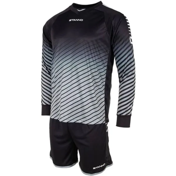 De Stanno Blitz keeperset voor kinderen en heren, met gesublimeerde streepprint op het shirt, is voorzien van beschermende padding op de ellebogen. De v-hals is vervaardigd uit body-materiaal, dat dankzij de ClimaTec finish zorgt voor optimale afvoer van zweet. De aansluitende manchetten zijn gemaakt van elastisch rib-materiaal. De bijpassende short heeft een elastische boord met aansnoerkoord. Materiaal: 100% Polyester