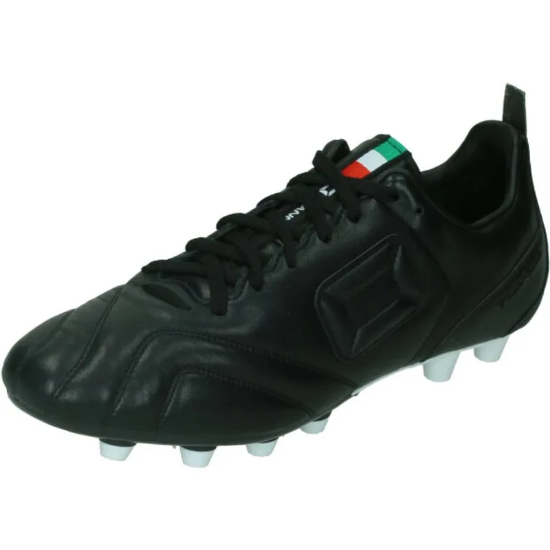 Classic is b(l)ack! Ga voetballen in stijl met deze klassieke voetbalschoenen van Stanno. De Stanno Nibbio Nero voetbalschoenen zijn gemaakt van leer en hebben een hiel van synthetisch PU. De doorgestikte en gespijkerde buitenzool zorgt voor een goede hechting aan het leer. De ergonomische schokabsorberende binnenzool garandeert een goede demping en uitstekende stabiliteit op het veld. Dankzij de extra vetergaten kun jij de schoenen zo strak strikken als jij zelf wil. Materiaal: Leer