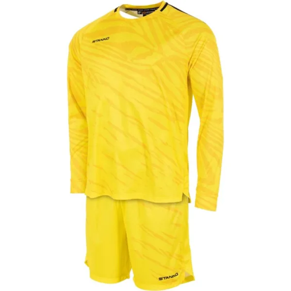 Deze Stanno Trick Long Sleeve Keeper Set voor kinderen en heren is voorzien van een gesublimeerde print en is geproduceerd met 100% gerecycled polyester. De shorts heeft een aansnoerkoord, waardoor het mooi op de plek blijft. Op de schouders en rechterborst zijn Stanno logoâs geprint. Het shirt heeft lange mouwen, een langere achterzijde en zijsplits die zorgen voor een optimale bewegingsvrijheid. De juniormaten zijn voorzien van beschermende padding op de ellebogen. Materiaal: 100% Gerecycled Polyester