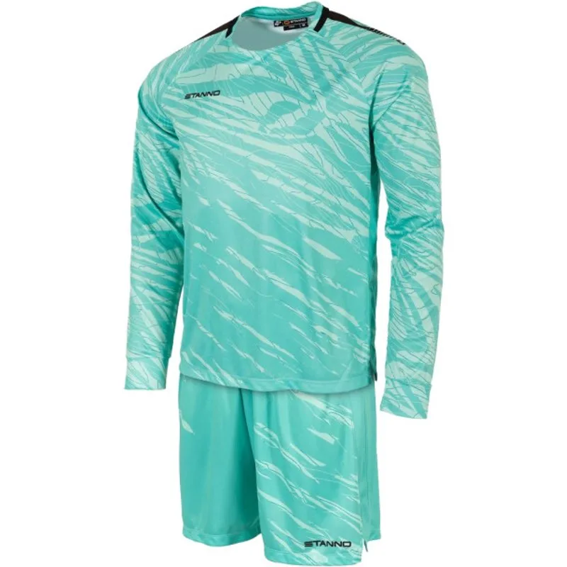 Deze Stanno Trick Long Sleeve Keeper Set voor kinderen en heren is voorzien van een gesublimeerde print en is geproduceerd met 100% gerecycled polyester. De shorts heeft een aansnoerkoord, waardoor het mooi op de plek blijft. Op de schouders en rechterborst zijn Stanno logoâs geprint. Het shirt heeft lange mouwen, een langere achterzijde en zijsplits die zorgen voor een optimale bewegingsvrijheid. De juniormaten zijn voorzien van beschermende padding op de ellebogen. Materiaal: 100% Gerecycled Polyester
