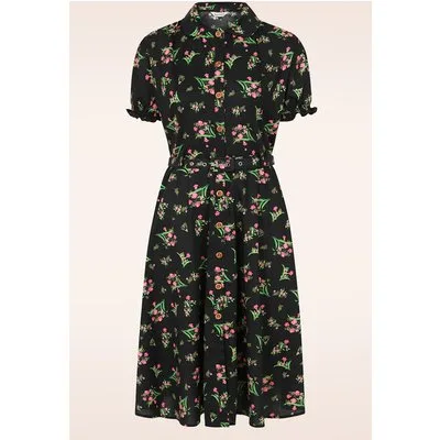 ''Bloom your own way!'' Straal in deze luchtige semi-swing beauty! Ze heeft een afgeronde kraag, speelse korte pofmouwtjes met elastiek en loopt uit in een prachtige semi-swing rok, die jou een prachtig vrouwelijk silhouet geeft! Uitgevoerd in een soepele en luchtige, zwarte 100% katoen voorzien van een prachtige bloemenprint in roze, groen en geel. * Semi-swing model * Afgeronde kraag * Korte pofmouwen met elastiek * Reeks knopen * Afneembare riem, voor een extra 'snatched' taille * Valt bij een lengte van 1,70 m tot halverwege de kuit