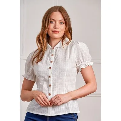 We zijn tot over onze oren verliefd op deze Star blouse! Deze cutie in wit is uitgevoerd in een luchtige katoen met speelse stiksels en dotjes. * Peter Pan kraag * Knopenrij * Korte pofmouwtjes met elastiek * Lang genoeg om op een normale heupbroek te dragen