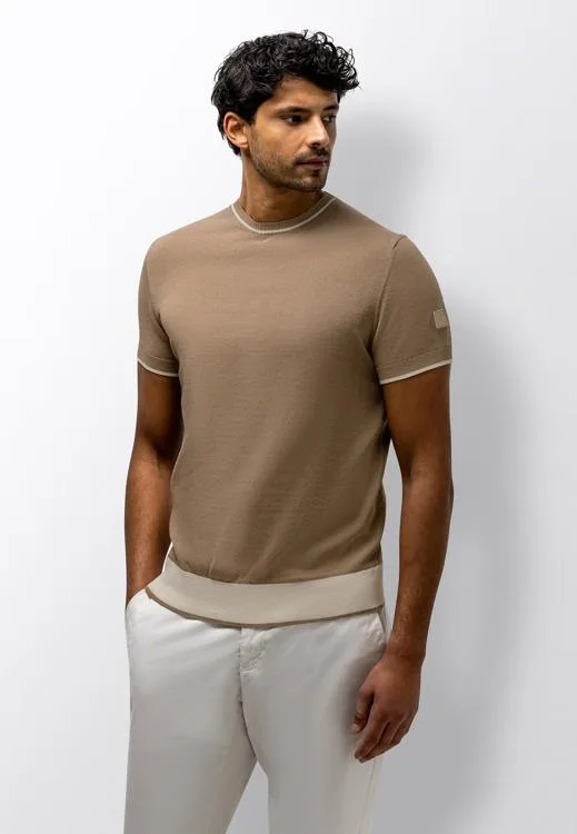De taupe tint en het minimalistische ontwerp geven het T-Shirt een moderne, rustige uitstraling voor heren. Je combineert het met een lichte chino, een indigo jeans of onder een blazer. Dankzij de contrasterende hals en ribzoom oogt het verzorgd bij kantoor, diner of weekend.
