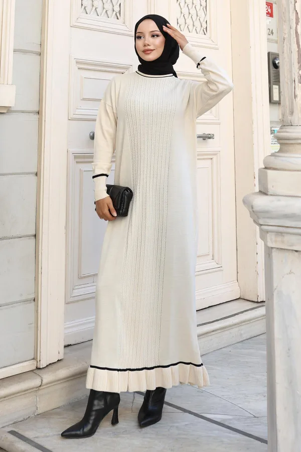 Stofkenmerk: Gemaakt van breiwerkstof. Productkenmerk: Nieuwe seizoens hijab modeproduct. Ongevoerd. Flexibele stof. Productkleur kan variëren door conceptfoto's. Standaardmaat op het model. Standaard maat afmetingen breiwerk jurk: Productlengte: 135 cm - Borst: 116 cm - Taille: 108 cm - Heupen: 108 cm