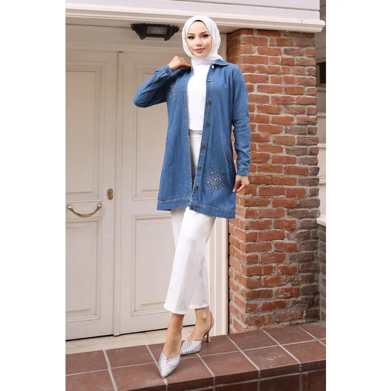Stofkenmerk: Gemaakt van dennenstof. Productkenmerk: Nieuw seizoens hijab modeproduct. Zonder voering. Het heeft bruikbare knopen aan de voorkant. De manchetknopen zijn actief. Er is een zak. De stenen zijn plakkerig. De productkleur kan afwijken door conceptfoto's. Het model draagt maat 38. Maat 38 Shirtafmetingen: Productlengte: 86 cm - Borst: 92 cm - Taille: 88 cm - Heupen: 98 cm. Lichaamsafmetingen nemen met 3 of 4 cm toe. (Productlengte verandert niet.)