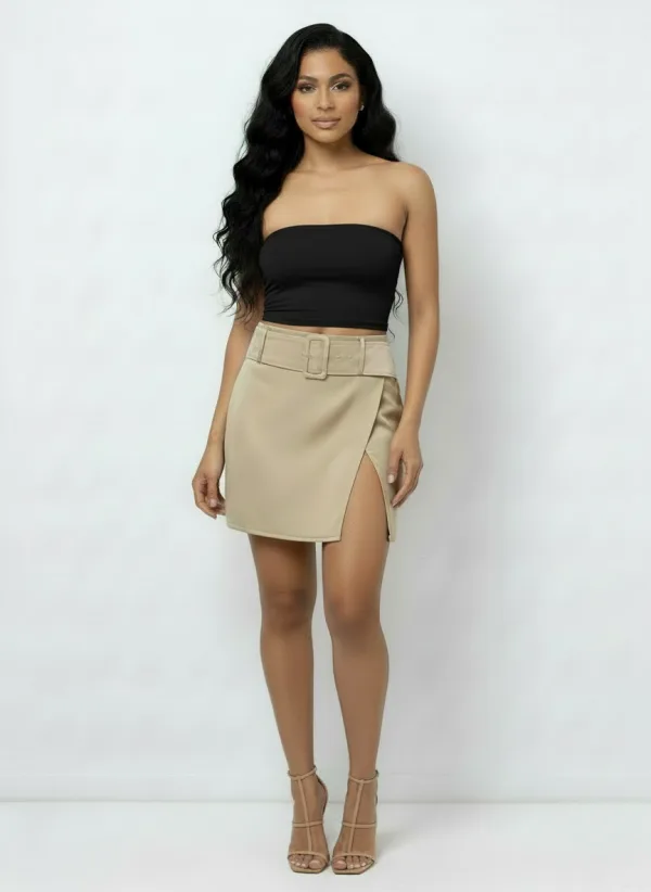 Deze steenkleurige wikkelrok is moeiteloos chic en onmiskenbaar gedurfd en geeft je dagelijkse garderobe een stoere uitstraling. De lage taille en mini-lengte zorgen voor een flatterend silhouet, terwijl de geïntegreerde riem in de taille voor een gepolijste afwerking zorgt. De rok is veelzijdig genoeg voor casual uitjes, maar ook opvallend genoeg voor een avondje uit. Hij past naadloos bij alles, van oversized T-shirts tot getailleerde tops.