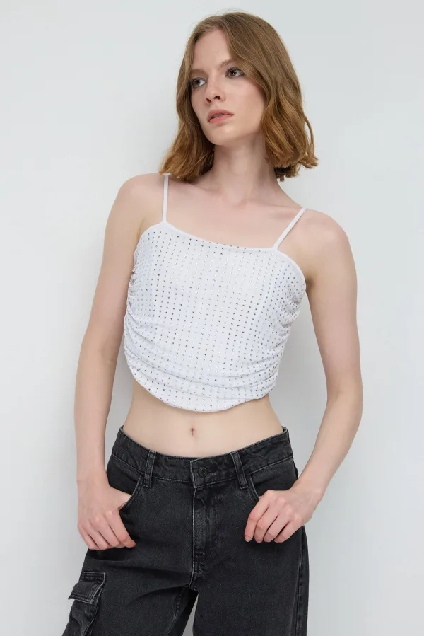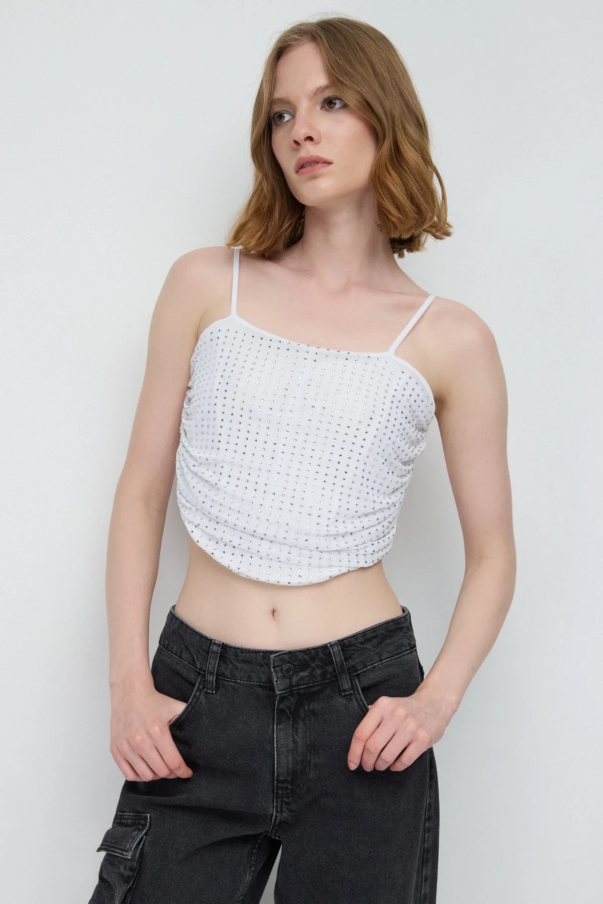 Design: Rug rits; Halstype: Ronde hals; Soort bandjes: Spaghettibandjes; Details: Sierstenen, Gedrapeerd; Extra's: Verstelbare bandjes, Applicaties; Pasvorm: Slanke pasvorm; Armlengte: Mouwloos; Lengte: Korte pasvorm