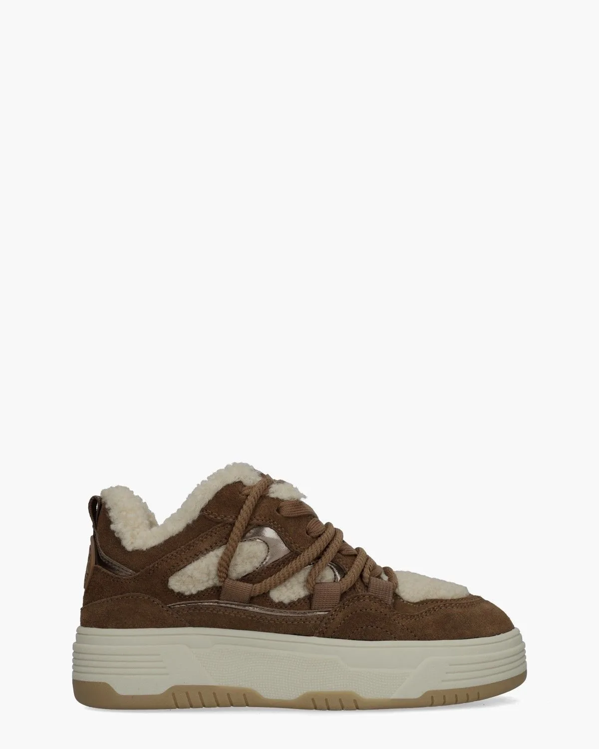 Chunky en cozy: de Boomer-F SM11003865-03006-839 damessneaker van Steve Madden heeft een bovenwerk van donkerbruin suède en metallic leer met warme wollen accenten in een gebroken witte tint. Binnenin zorgt de mix van wol en stof voor een zachte pasvorm, terwijl het vaste voetbed stabiliteit biedt. De robuuste rubberen platformzool van 4 cm