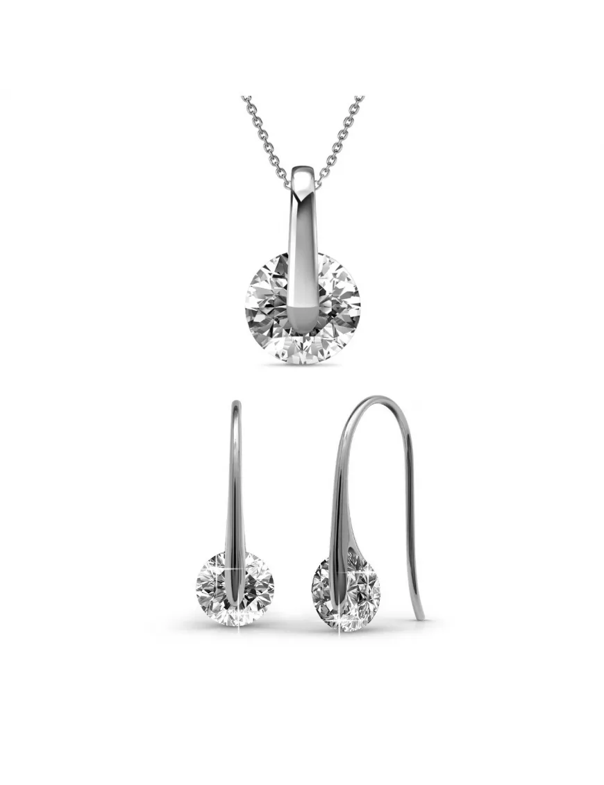 Samenstelling: hoogwaardig messing Afwerking: gerhodineerd Steensoort: Oostenrijks kristal Aantal stenen (stuks): 3 Steenkleur: kristal Kettinglengte: 400 + 50 Lengte oorbellen (mm): 30 cm