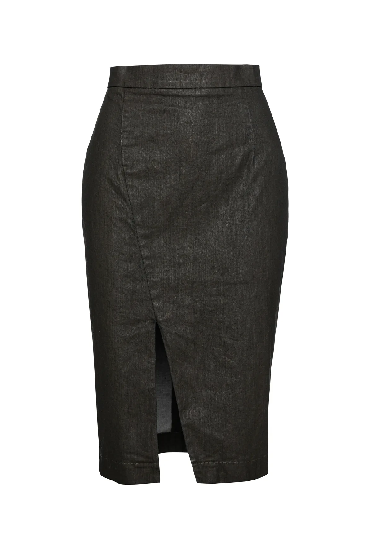 Stofgroene kokerrok. Tailleband. Split vooraan die iets uit het midden begint en in het midden eindigt. Sluit aan de achterkant met een goudmetalen rits. Gevoerd. Ons model is 176cm en draagt maat 36/S. Afmetingen voor maat 36/S (in cm): Taille-34, Onderkant-43, Lichaamslengte-68. 92% katoen-8% elastan. Accessoires zijn niet inbegrepen.