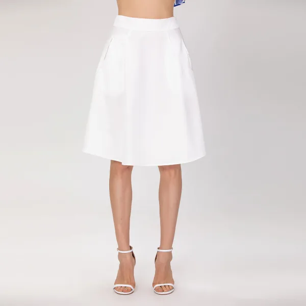 Een zeer uitlopende rok met twee steekzakken en twee doorgestikte uitsparingen aan de voorkant. Te combineren met blouses, overhemden en blazers. Een onmisbaar item in je garderobe, geschikt voor zowel casual als meer verfijnde dagelijkse gelegenheden. Productdetails: Vorm: trapezium Lengte: 71 cm Zakken aan de zijkant Onzichtbare rits aan de linkerkant