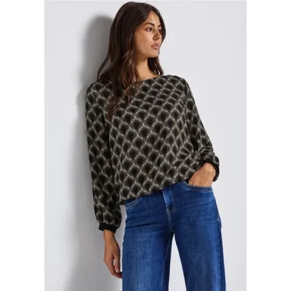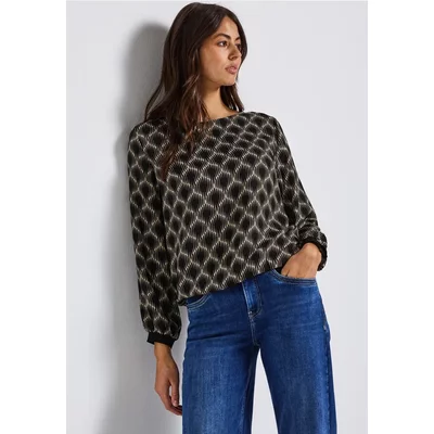 Met zijn grafische patroon en vloeiende snit is deze Street One blouse een modieuze blikvanger voor vrouwen. De bateau halslijn, lange mouwen met manchetten en elastische zoom creëren een vrouwelijk silhouet. Zuivere viscose geeft de blouse een aangenaam zachte drapering - perfect voor stijlvolle alledaagse looks.