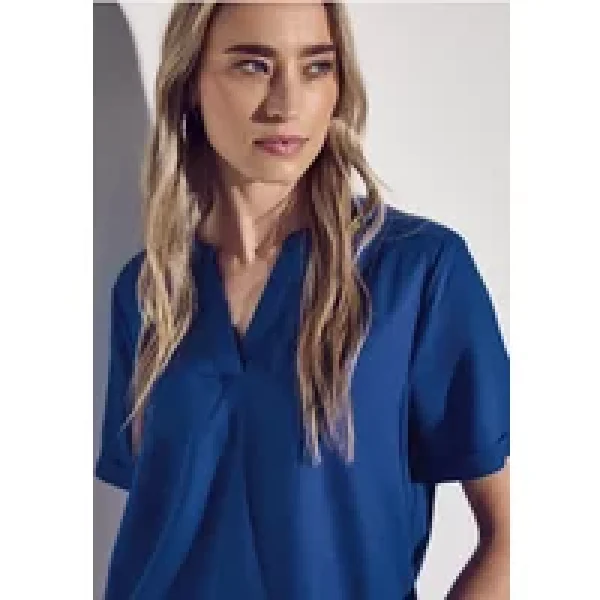 Deze damesblouse van Street One heeft een ronde halslijn met split en korte mouwen voor een frisse look. De afgeronde zoom geeft de blouse een casual touch, terwijl de zachte viscose zorgt voor een vloeiend silhouet en een comfortabel gevoel.