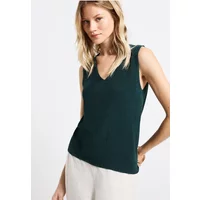 Deze gebreide top van Street One voor dames heeft een moderne gebreide textuur en een vrouwelijke V-hals. De comfortabele viscosemix zorgt voor een zacht gevoel en maakt de mouwloze top tot het perfecte laagjesstuk.