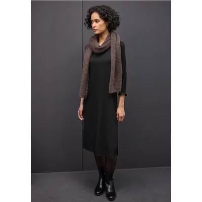 De geribde midi-jurk van Street One voor dames speelt handig met vrouwelijke details. Splitjes aan de zijkanten, ruches op de mouwen en een klassieke ronde halslijn maken er een stijlvol stuk van. De comfortabele stof voelt zacht aan en benadrukt je silhouet op een moderne manier.
