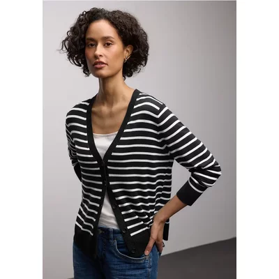 Dit gestreepte vest van Street One heeft een zachte viscosemix, V-hals en lange mouwen - knus maar modieus met geribde boorden. De gestreepte look geeft dit vest een maritieme flair en maakt het veelzijdig voor dagelijks gebruik. Kies dit vest als je gebreid comfort wilt combineren met een voorliefde voor patronen.