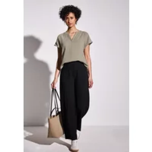 Deze mousseline blouse van Street One voor dames heeft een openvallende halslijn en maakt indruk door de zachte katoenen stof met een fijne textuur. De overhangende schouders geven de blouse een casual look en maken hem de ideale metgezel voor je dagelijkse outfits.