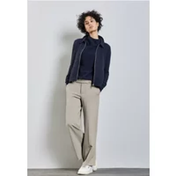 Deze broek met rechte pijpen in een casual pasvorm van Street One voor dames heeft een modieuze pasvorm met hoge taille en steekzakken. De viscosemix met stretch zorgt voor draagcomfort en het knoopdetail op de tailleband geeft de broek net dat beetje extra. Een veelzijdige basic voor je garderobe.