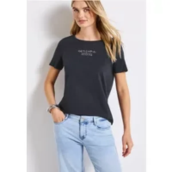 Met een modieus kunstwerk op de voorkant is dit Shirt van Street One voor dames een echte blikvanger. De ronde hals en korte mouwen zorgen voor klassiek comfort, terwijl het zuivere katoen aangenaam aanvoelt op de huid. Perfect voor ontspannen stijlen met een vleugje creativiteit.
