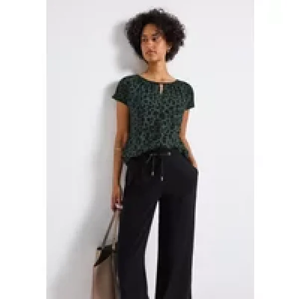 Het shirt met Street One print voor dames combineert een casual snit met modieuze details. De uitsnijding bij de hals en de zachte viscose voorkant maken het een luchtige metgezel voor warme dagen, terwijl de achterkant is gemaakt van een rekbare viscosemix en bijzonder comfortabel is. Lage schouders zorgen voor een ontspannen pasvorm.