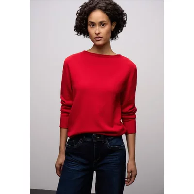 Met zijn gerolde zoom en vrouwelijke boothals geeft deze gebreide trui van Street One voor dames een speelse touch aan je look. De comfortabele pasvorm maakt hem ideaal voor knusse en stijlvolle outfits.