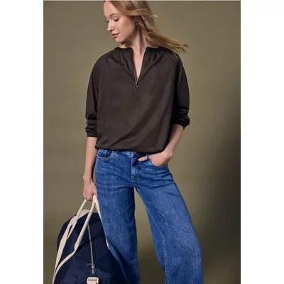 De velours blouse van Street One Studio voor dames combineert een trendy look. Een ronde halslijn met ritssluiting, lange mouwen met elastische manchetten en een elastische zoom creëren een modern silhouet. De zachte veloursstof maakt het een feelgood stuk voor speciale looks.