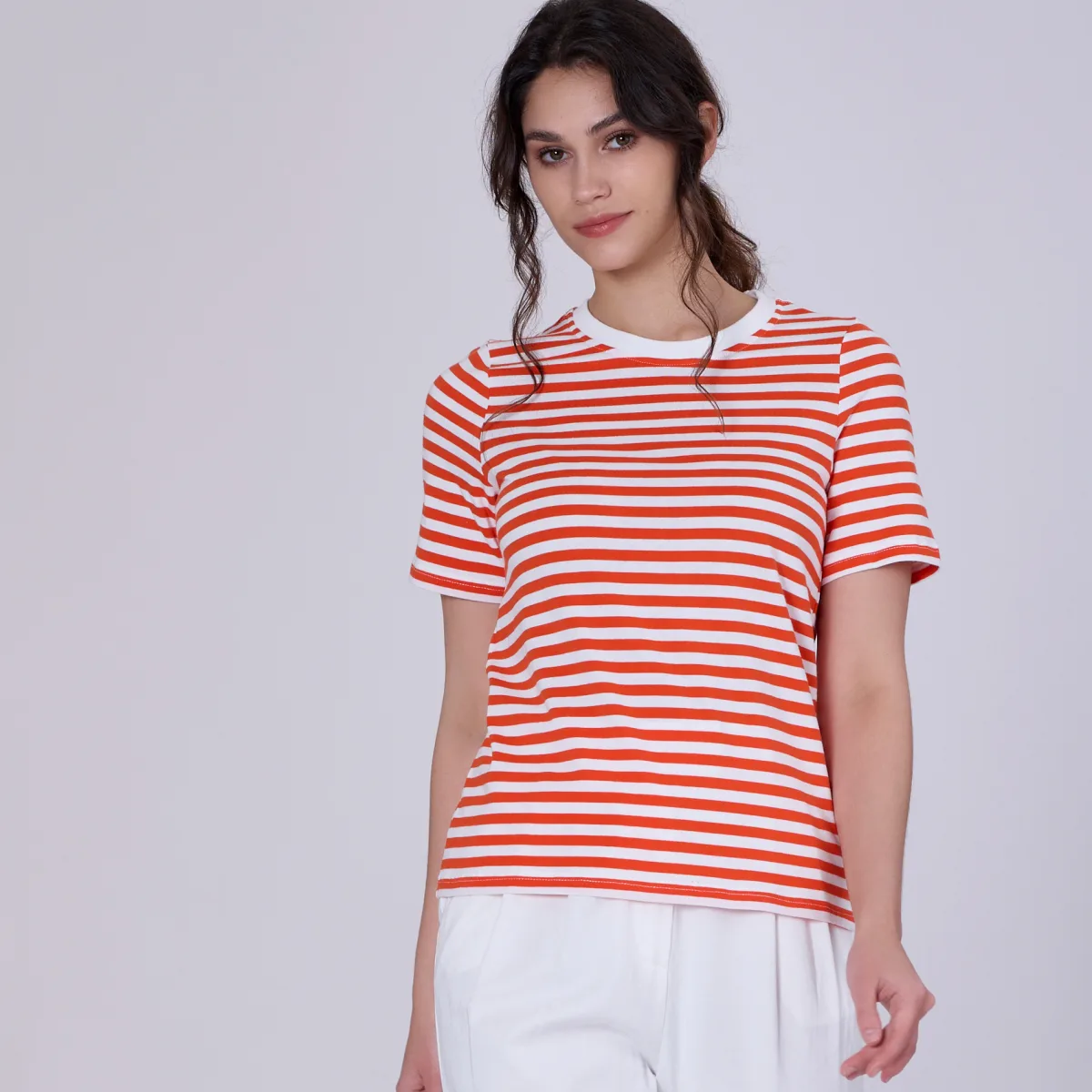Een eenvoudige en comfortabele snit, dit T-shirt heeft horizontale strepen en een ronde nek. Een geweldige klassieker in elke garderobe, de matroosstijl is tijdloos en kan worden gedragen voor informele gelegenheden op vakantie of worden gekoppeld aan een blazer voor een kantooroutfit. Productdetails: Lengte: 62 cm Model draagt maat 10 Modelhoogte is 5 "7 Vorm: recht Korte mouwen Ronde kraag