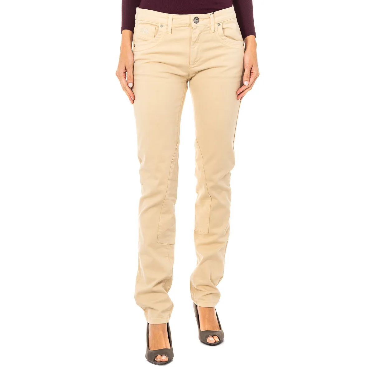 Stretch broek, elastiek. Beige Laag met skinny snit. Knoop- en ritssluiting. Twee zakken aan de voorkant, en minizakje met geborduurd merklogodetail. Twee open zakken op de achterkant, waarvan één met studs detail. Riemlussen. Naden in toon zichtbaar. Samenstelling: 97% Katoen - 3% Elastaan Wasvoorschriften: - Maximaal wassen op 40ºC. - Strijken op gemiddelde temperatuur, max. 110 ° C. - Droger mag gebruikt worden. - Geen bleekmiddel gebruiken. - Kan niet chemisch gereinigd worden. Samenstelling: 97% Katoen, 3% Elastaan Onderhoud: - Maximaal wassen op 40ºC. - Strijken op gemiddelde temperatuur, max. 110ºC. - Kan in de droger. - Geen bleekmiddel gebruiken. - Kan niet chemisch gereinigd worden.