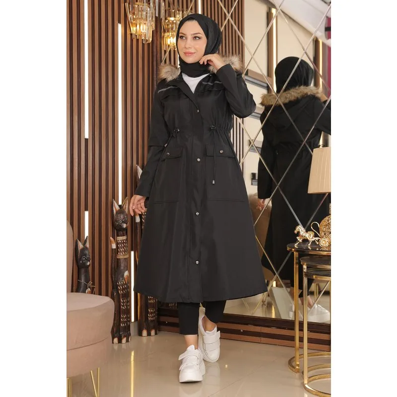 Stoffe kenmerk: Gemaakt van Bondit-stof. Productkenmerk: Nieuwe seizoens hijab modeproduct. Voering van bont. Voorzien van een rits aan de voorkant. Zak beschikbaar. Met capuchon. Gestrikt op de taille. Productkleur kan variëren door conceptfoto's. Het model draagt maat 38. Maat 38 Jasmetingen: Productlengte: 116 cm - Borst: 102 cm - Taille: 96 cm - Heupen: 108 cm Lichaamsmetingen nemen toe met 3 of 4 cm. (Productlengte verandert niet)