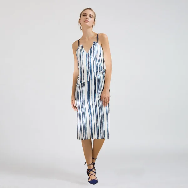 Met een flatterende snit, de taille benadrukt met een boog om aan de linkerkant te knopen en een verleidelijke splitsing, heeft deze jurk een digitale streepprint. Volledig bekleed met een zacht en ademend flanel. Geschikt voor verschillende gelegenheden die zich aankleden, brengt een echte voorsprong op je garderobe en heeft de veelzijdigheid om je van dag tot nacht met rand en elegantie te brengen. Productdetails: • V-neckline • Mouwloos • Lengte onder de knie: 110 cm • bevestigd met verborgen rits in het middenachter
