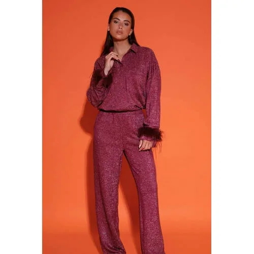 Deze blouse van Studio AMAYA heeft lange rechte mouwen en een kleur. De blouse sluit met knopen en heeft een kraag. Je ziet glitters en veren verwerkt in het ontwerp voor een opvallende uitstraling.