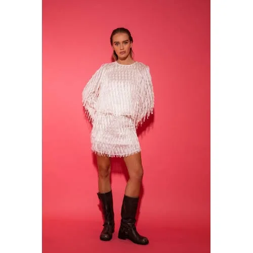 De Studio Amaya Addison rok met franjes in off white is dé eyecatcher voor elke feestelijke gelegenheid. Deze mini-rok straalt glamour en beweging uit dankzij de sierlijke franjes die bij elke stap met je meedansen. De rok heeft een rechte, flatterende pasvorm en een zachte onderlaag die zorgt voor comfort zonder in te leveren op stijl. Perfect voor een avondje uit, een festival of een speciale gelegenheid waar je wil stralen. Draag de Addison rok met de bijpassende Flo top voor een co-ord set die niet onopgemerkt blijft. Combineer met laarzen of hakken en je bent party ready! Product details: Merk: Studio Amaya Model: Addison rok Kleur: Off white Pasvorm: Slim fit, mini-lengte Taille: Normale taille Details: Volledig bedekt met franjes Materiaal: 100% polyester Stijl: Glamourous, opvallend, feestelijk Model info: Het model is 176 cm en draagt maat S