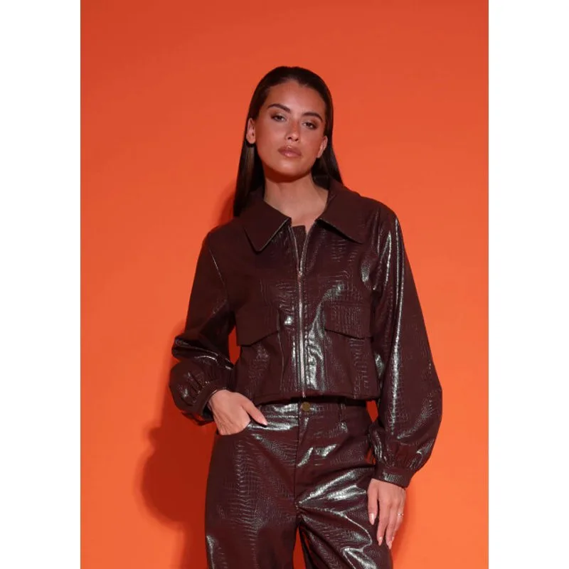 Het Studio Amaya Lara jasje in diepbruin croco vegan leather is een eigentijds statement piece met een luxueuze uitstraling. Het korte model is ontworpen met een klassieke kraag, stoere borstzakken met klep en een ritssluiting aan de voorzijde. De elastische zoom zorgt voor een subtiele blousonvorm, terwijl de glanzende croco structuur het jasje een opvallend karakter geeft. Combineer met de bijpassende Wilow broek of draag het los over een basic top. Product details: Merk: Studio Amaya Model: Lara Kleur: Donkerbruin Kort jasje met ritssluiting Vegan leather met croco structuur Elastische zoom en manchetten Klepzakken op de borst Materiaal: 50% polyurethaan, 50% polyester Het model is 175 cm en draagt maat S