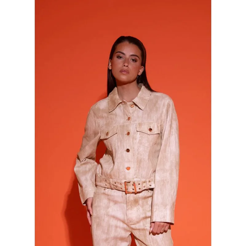 De Solene jacket van Studio Amaya is een echte blikvanger dankzij het unieke geborstelde denim in een warme beige tint. Dit cropped jasje heeft een stevige, doch vrouwelijke pasvorm en is afgewerkt met een bijpassende ceintuur die je taille elegant accentueert. De gouden knopen en klepzakken op de borst geven het jasje een stoere touch, terwijl het tijdloze silhouet moeiteloos combineert met zowel de bijpassende Junoa broek als andere basics in je garderobe. Gemaakt van comfortabel denim met een zachte stretch, biedt dit jasje niet alleen stijl maar ook draaggemak. Perfect voor een monochrome look of als statement piece in een gelaagde outfit. Product details: Merk: Studio Amaya Model: Solene jasje Kleur: Beige denim met washed effect Gouden knoopsluiting aan voorzijde en op de borstzakken Bijpassende afneembare ceintuur met goudkleurige gesp Rechte pasvorm met lichte taille-accentuering Materiaal: 90% katoen, 10% viscose Valt normaal op maat