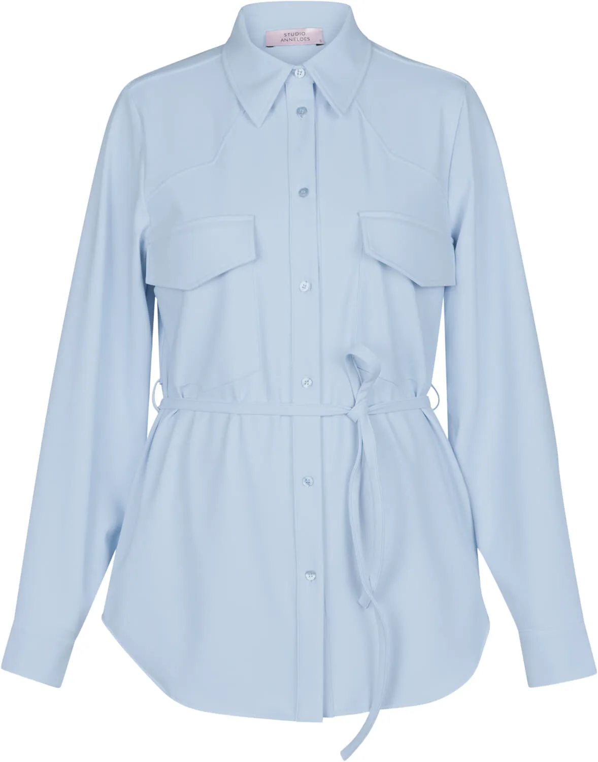 Overhemd Bodil Bonded van Studio Anneloes is een overshirt met regular pasvorm, spreidkraag, lange mouwen met manchetten en knopen, en een knoopsluiting. De effen stof heeft borstzakken en een strikceintuur voor tailleaccent. Combineer met een nette broek of denim voor casual.