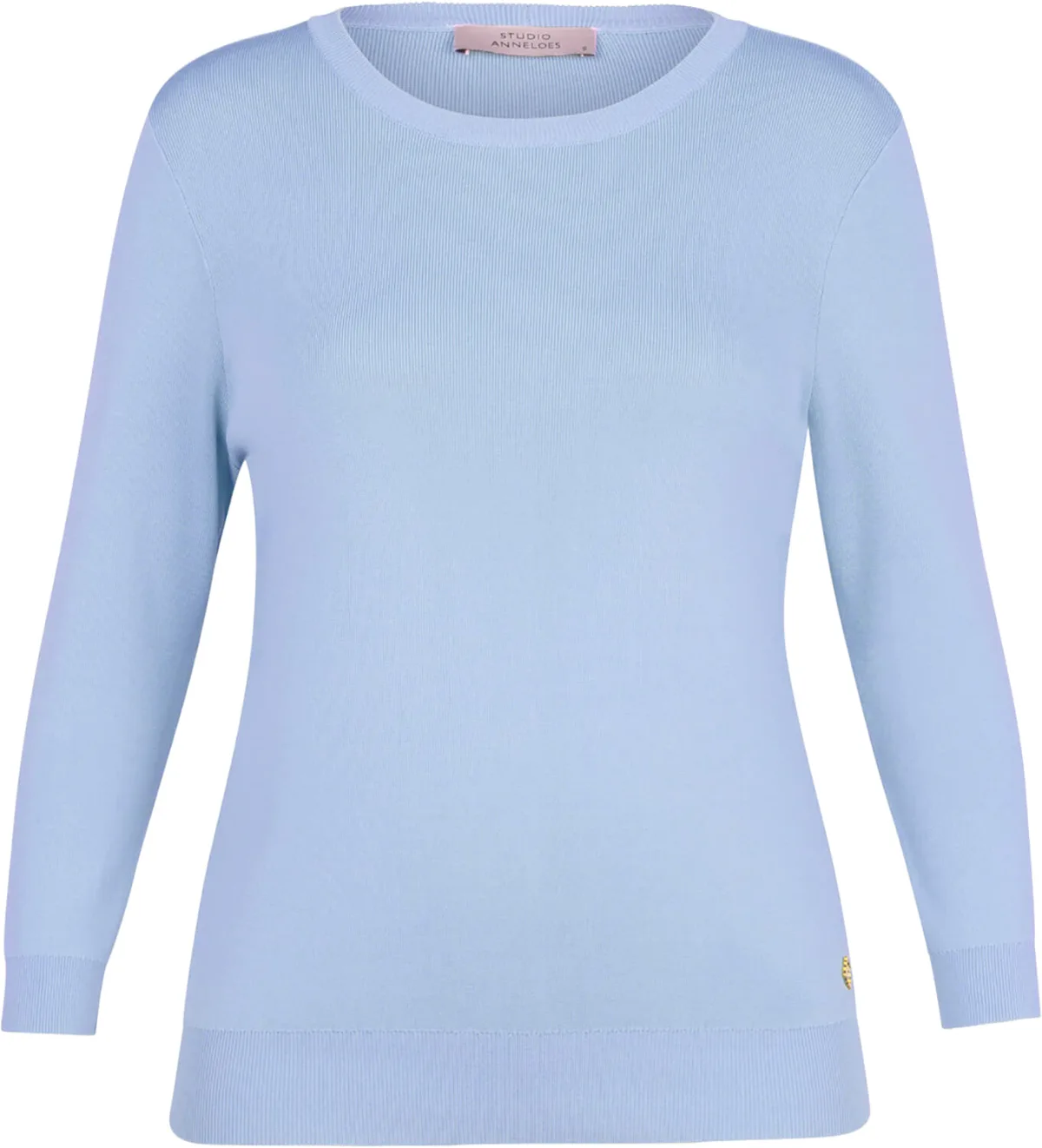 Pullover Luna 3/4 Mouw van Studio Anneloes is een trui met ronde hals, regular pasvorm en effen, lichtblauwe kleur. De lange mouwen hebben ribgebreide boorden voor een nette afwerking. Draag casual op een pantalon of jeans voor een rustige, minimalistische stijl.